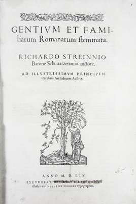 Gentium et familiarum Romanarum stemmata. [Geneva]: Estienne, 1559. Folio, collates: *i-iiii, [ff.1], A2-A8, B1-G8, [1ff. manuscript index], contemporary limp vellum, from the collection of Stanley Seeger, some annotations in an early hand [USTC 450491]