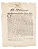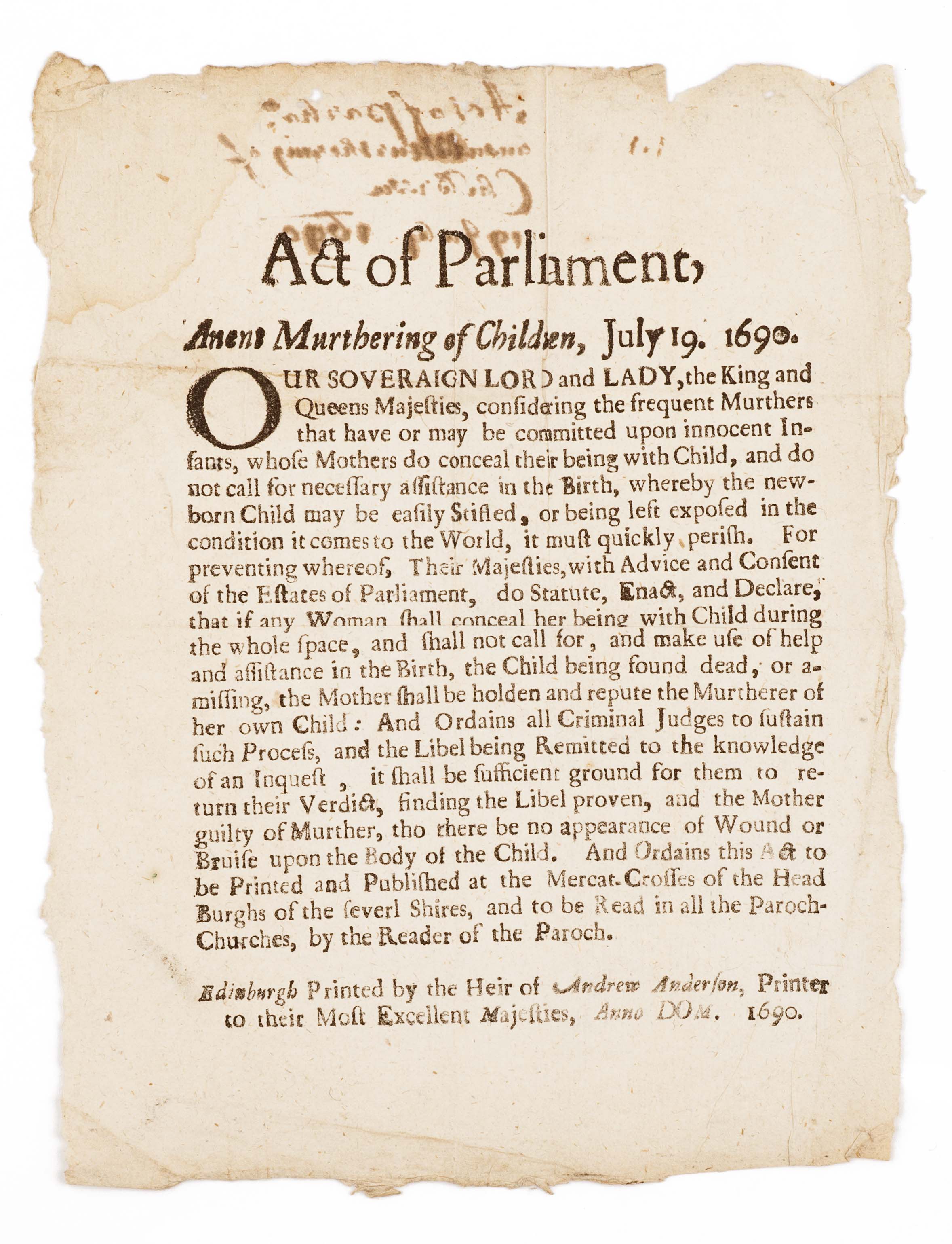 Act of Parliament anent murthering of children, July 19. 1690. Edinburgh: printed by the heir of Andrew Anderson... 1690. Handbill, c.20x15cm, with manuscript title to verso [ESTC R183919, listing one copy of this printing and 2 copies of variant printings]
