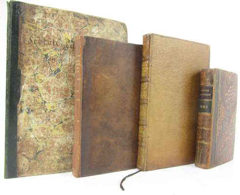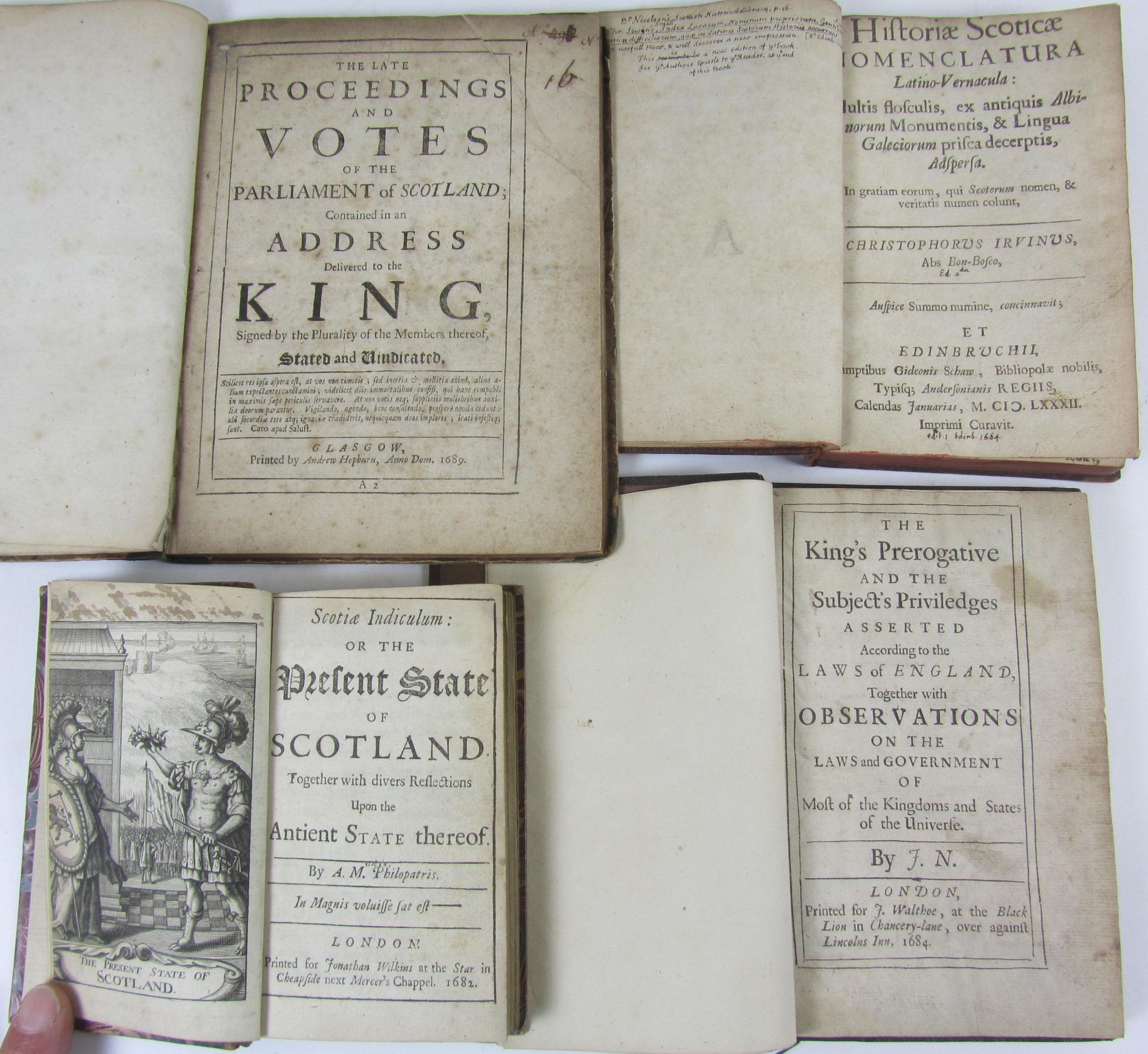 The late proceedings and votes of the Parliament of Scotland. Glasgow: A. Hepburn, 1689. 4to, [40, 31-46, [2], 59-63,], nineteenth century half calf, without initial and final blank, some spotting; [ESTC R203814]; [Mudie, Alexander] Scotiae Indiculum, or the present state of Scotland. London: J. Wilkins, 1682. First edition, 12mo, engraved frontispiece, 19th century half calf, without advert leaf at end, [ESTC R38926]; Irvine, Christopher Historiae Scoticae nomenclatura Latino-Vernacula. Edinburgh: G. Shaw, 1682. 8vo, [16], 253, [3], eighteenth century calf, slightly dampstained, a few headlines shaved, neatly rebacked, [ESTC R30360]; [Jenkins, David] The King's prerogative and the subject's priviledges asserted. London: J. Walthoe, 1684. 8vo, 19th century brown morocco, bookplate on title verso of John Borthwick of Crookston, [ESTC R7407]; [Warriston, Archibald Johnston, Lord] Causes of the Lords wrath against Scotland... [London?], 1653. Small 4to, lacking several leaves, some shaving to text [ESTC R211118] (5)