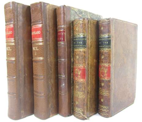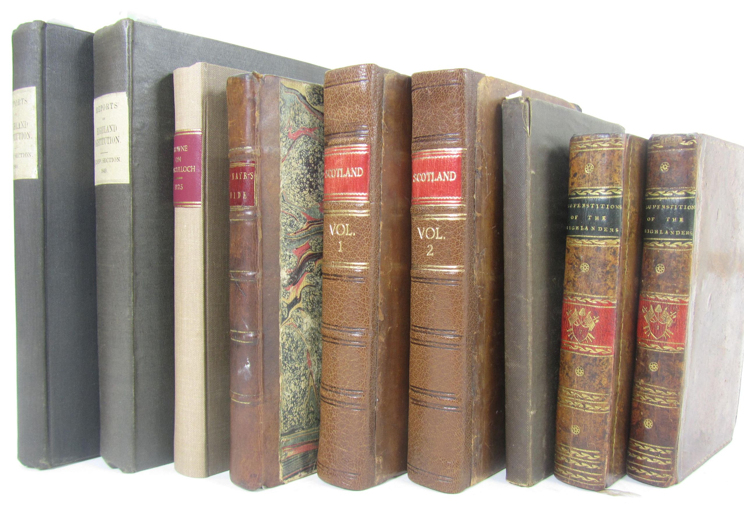 Essays on the superstitions of the Highlanders of Scotland. London, 1811. 2 volumes, 12mo, contemporary calf gilt, name excised from title of volume 2, M'Nayr, James A guide from Glasgow to... the Highlands of Scotland. Glasgow, 1797. First edition, 8vo, contemporary half calf; [Burt, Edward] Letters from a gentleman in the North of Scotland. London, 1754. First edition, 2 volumes, 8vo, frontispiece and 8 plates, contemporary calf, neatly rebacked; Graham, John, 1st Viscount Dundee Memoirs of the Lord Viscount Dundee, the Highland Clans. Glasgow, 1818, 8vo, bound with 2 other tracts, cloth; Edinburgh Section of the Central Board for the Relief of Destitution in the Highlands and Islands of Scotland for 1848 [1849]. First-Fourth Report in one volume; [First-Third Report in one volume], original cloth; [Browne, James] A critical examination of Dr. Macculloch's work on the Highlands and Western Isles of Scotland. Edinburgh, 1825. 8vo, modern cloth (9)