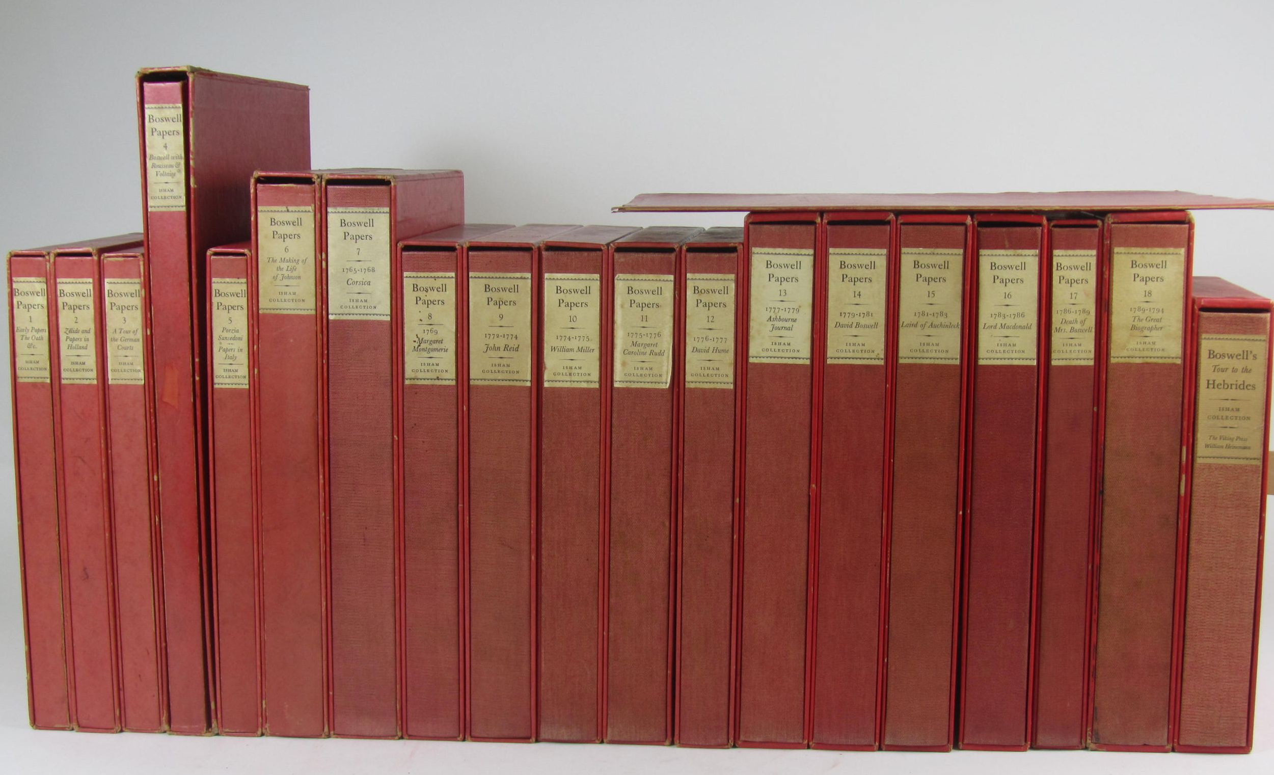 Private papers from Malahide Castle in the collection of Ralph Heyward Isham. [N.p.], 1928-34, 1936. 19 volumes (including Journal of a tour to the Hebrides, 1936), plus bibliography of volumes i-vi accompanying volume iv, 4to, limited to 570 copies of which volumes in this set originate from numbers 504, 518 & 506, original red card covers in slipcases, sold not subject to return (19)
