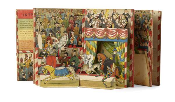 International circus. London: H. Grevel & Co., [1889?] 33.5 x 22.5cm, comprising eight chromolithographed concertina panels (6 pop-up images), first pop-up lacking figure of man riding a jumping horse, in the second pop-up the red rim has been trimmed from clown's hoop, the fifth pop-up lacks the acrobats' props and sections of limbs, the sixth pop-up is lacking the female acrobat and the male acrobat's hand, fourth panel becoming detached, a little soiling, some wear and rubbing, some pencil scribbles to upper cover