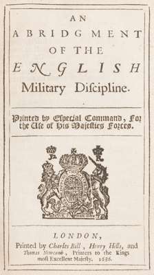 An abridgment of the English military discipline. London: printed by Charles Bill..., 1686. 8vo [ESTC R9769, listing 5 copies in libraries in the British Isles and 6 copies in North American libraries]; [bound with] Rules and articles for the better government of His Majesties land-forces in pay during this present rebellion. London: printed by Charles Bill..., 1685. 8vo [ESTC R223873, listing only one copy of this printing]; contemporary calf with gilt tooling to spine, fine copy internally with a couple of small spots, contained in hand-made velvet lined case crafted from an album