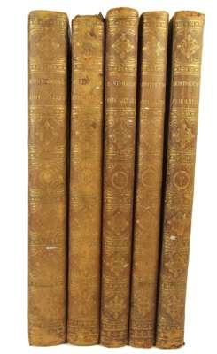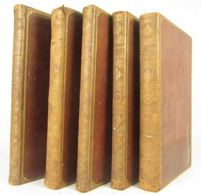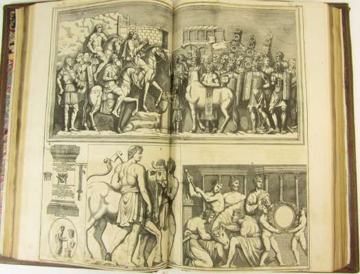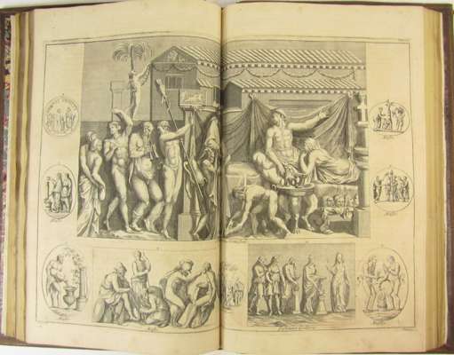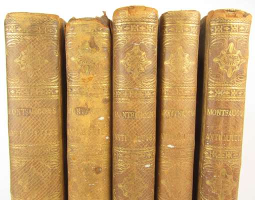 Antiquity explained, and represented in sculptures, translated by David Humphreys. London: J. Tonson & J. Watts, 1721-22. First edition in English, 5 volumes, [without the Supplement], folio, 320 engraved plates (complete for set without Supplement), contemporary diced calf, some spotting, slightly rubbed, head of volume 2 and head and tail of volume 5 worn