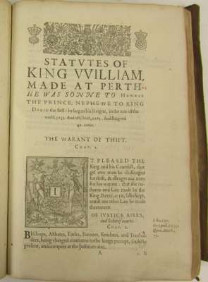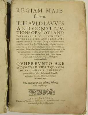Regiam Majestatem. The auld lawes and constitutions of Scotland. Edinburgh: T. Finlason, 1609. Folio, 2 parts in one volume, woodcut initials and ornaments, contemporary vellum, [ESTC S117424 ], some wear to one yapp edge, hinges broken