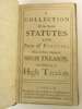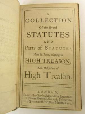 A collection of the several statutes, and parts of statutes, now in force relating to high treason, and misprision of high treason. London: printed by Charles Bell, and the Executrix of Thomas Newcomb, Printers to the Queens most Excellent Majesty, 1709. 2 parts in one volume, 12mo, contemporary black morocco with gilt embossed arms of Queen Anne to covers, gilt tooling, g.e., bookplate, a few library blindstamps, a few small rust-spots, a little rubbing [ESTC T136807]