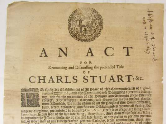 An Act for renouncing and disanulling the pretended title of Charles Stuart &c. London: printed by Henry Hills and John Field, 1656 [ie. 1657], broadside in two sheets (versos blank), each 325 x 220mm, woodcut seal of the Commonwealth, woodcut initial, [Wing E1063; ESTC R211925 (11 copies in UK, one in USA], central horizontal folds, light browning, contemporary ink note at top right