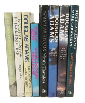The hitch hiker's guide to the galaxy. London: Arthur Barker, 1979. First edition, 8vo, original blue cloth gilt, dust-jacket not price-clipped but slightly bumped, spine faded, some very slight dampstaining, slight soiling to lower cover, slight soiling to p.93; [Idem] The restaurant at the end of the universe. London: Arthur Barker, 1980. First edition, 8vo, original green cloth gilt, dust-jacket; a little very light spotting; [Idem] Life the universe and everything. London: Arthur Barker, 1982. First edition, 8vo, original blue cloth gilt, some very slight occasional foxing; [Idem] So long, and thanks for all the fish. New York: Harmony Books, 1984. First US edition, 8vo, original black cloth gilt, chip to lower cover; [Idem] Mostly harmless. London: Heinemann, 1992. Fourth impression, 8vo, original grey cloth gilt, dust-jacket a little bumped with small tear; [Idem] Dirk Gently's holistic detective agency. London: Heinemann, 1987. Second impression, 8vo, dust-jacket; [Idem] The long dark tea-time of the soul. London: Heinemann, 1988. First edition, 8vo, dust-jacket; and one other (8)