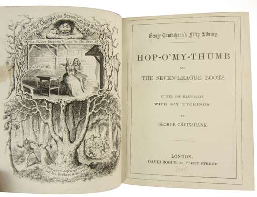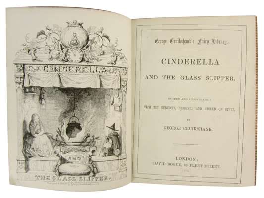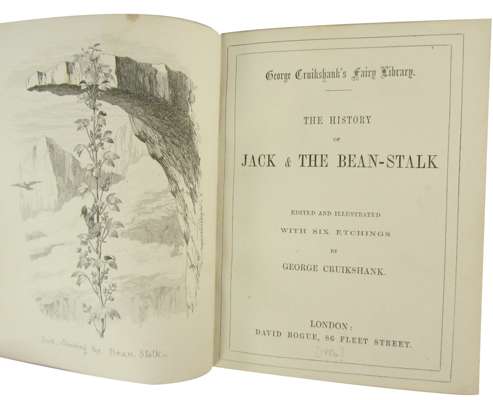 George Cruickshank's fairy library [Cinderella and the glass slipper. Hop-o' my-thumb. The history of Jack & the beanstalk]. London: David Bogue, [1854], 3 volumes, 8vo, 26 etched images on 18 plates by Cruickshank, uniformly bound in nineteenth-century calf gilt by Rivière, spines gilt in compartments, green morocco lettering-pieces, edges gilt, ownership inscription on front free endpaper, occasional slight spotting, covers slightly scuffed, joints slightly worn (3)