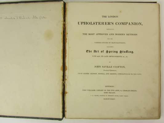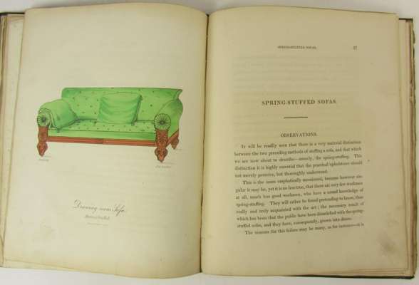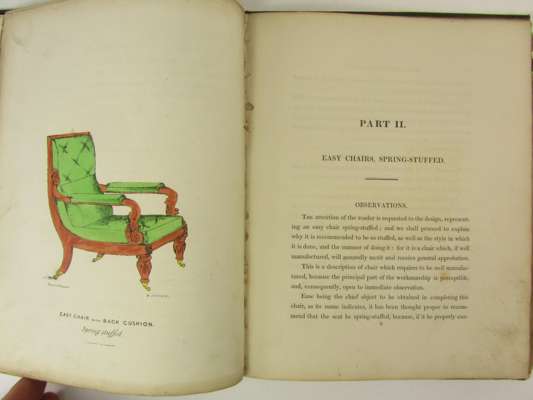 The London upholsterer's companion. London: John Williams, 1824. First edition, 4to, [xvi], 89, 4pp. adverts; 13 lithographed plates, 10 coloured, and one coloured illustration, contemporary cloth, some spotting and soiling, stitching weak, rubbed, VERY RARE: only one copy located on Copac (BL).