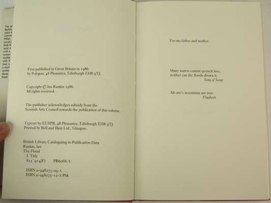 The flood. Edinburgh: Polygon, 1986. First [hardback] edition, 8vo, signed by the author to title-page, original red cloth gilt, dust-jacket very slightly soiled