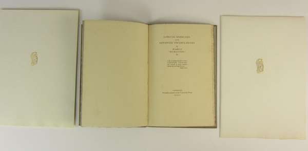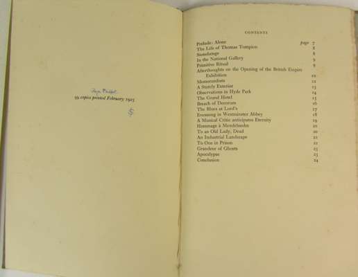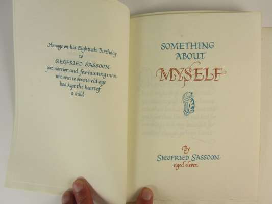 Lingual exercises for advanced vocabularians. Cambridge: privately printed at the University Press, 1925. 8vo, one of 99 copies, inscribed "Glyn Philpot" by Sassoon with Sassoon's monogram to limitation page, original brown buckram, uncut, a little light spotting, covers very slightly rubbed and faded with small mark to lower cover; Sassoon, Siegfried Something about myself. Written and illustrated by Margaret Adams, reproduced from line blocks made by Siviter Smith Ltd. Worcester: Stanbrook Abbey Press, 1966. 2 copies, 4to, coloured type and illustrations, original pictorial wrappers, uncut (3)