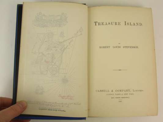 Treasure Island. London: Cassell & Company, Limited, 1883. First edition, later issue [?], original blue cloth with gilt lettering to spine, map frontispiece, 4pp. adverts, shelf-lean, spine faded, some wear and soiling to covers, hinges splitting, a little soiling and occasional foxing [Yale University 240, Prideaux 11]