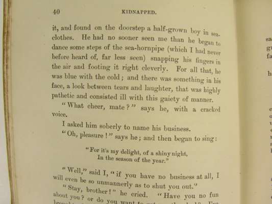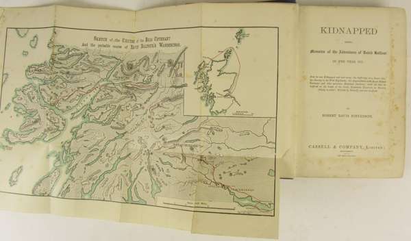 Kidnapped. Cassell & Company, Ltd., 1886. First edition, first issue, with "business" p.40 line 11, "nine o'clock" p.64 line 1; "Long Islands" p.101 lines 9/10; 16pp. adverts dated 5G.4.86, folding map, original blue cloth, W.H. Smith Subscription Library label to front endpaper, some spotting, hinges weak, rubbed and soiled