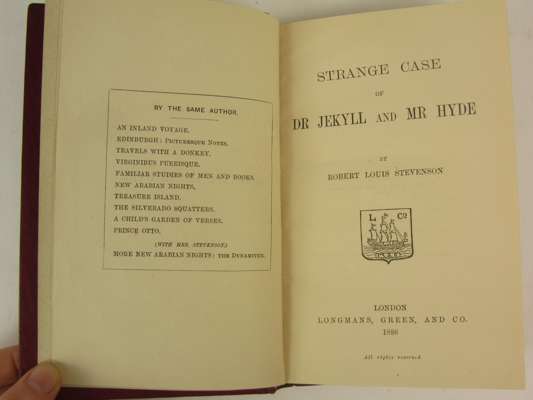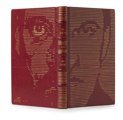 Strange case of Dr Jekyll and Mr Hyde. London: Longmans, Green, and Co., 1886. First edition, 8vo, red morocco by Sangorski & Sutcliffe (binder's stamp to rear doublures), with gilt tooling to covers showing the faces of Jekyll and Hyde, spine banded in 6 compartments with gilt lettering and tooling, a.e.g., a couple of small ink marks to pp.56-7, ownership signature dated 1886 to half-title, some very slight rubbing to covers, slipcase [Prideaux, 17]