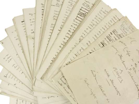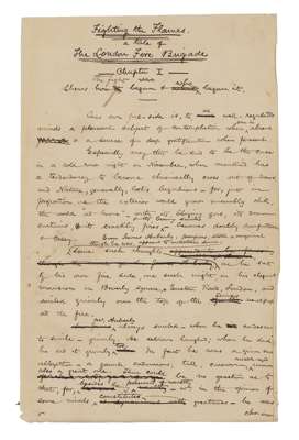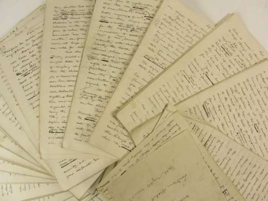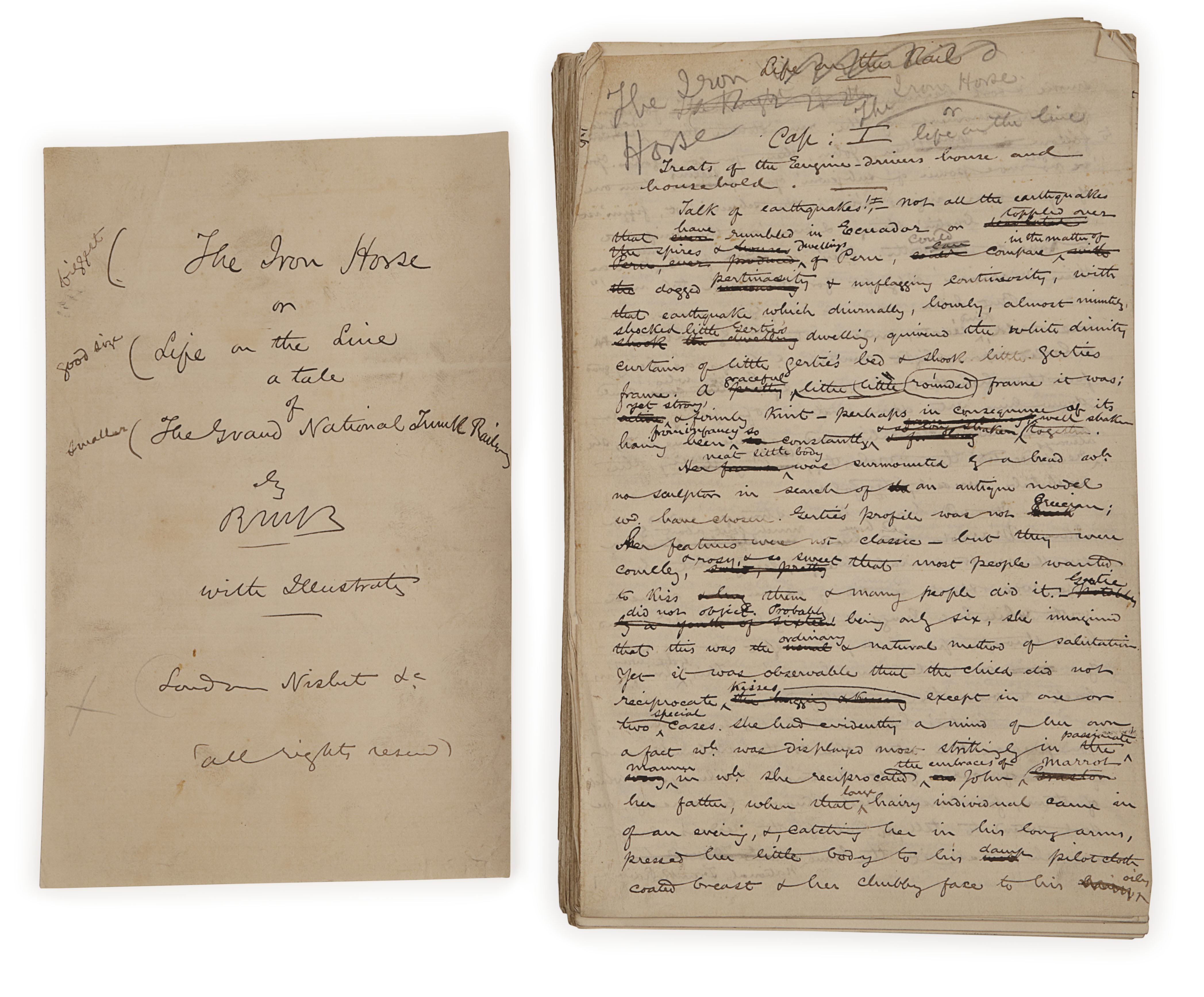 Autograph manuscript of "The Iron Horse, or life on the Line. A Tale of the Grand National Trunk Railway", 8vo, pp. [2]-70, 1-29, 71-322. Unbound, 1871, manuscript with a mock-up title page by Ballantyne (with instructions to the printer on font size) and is initialled and dated Edinburgh 16 August 1871 at the end. The extra 20 page section in the pagination is an "aside" by Ballantyne on the history of the "Iron-Horse". Probably written after the main manuscript was completed, Ballantyne instructs the printer to confirm it will be inserted in the correct place, heavily corrected and amended by the author, title page a little dusty, glue stain to the last leaf
