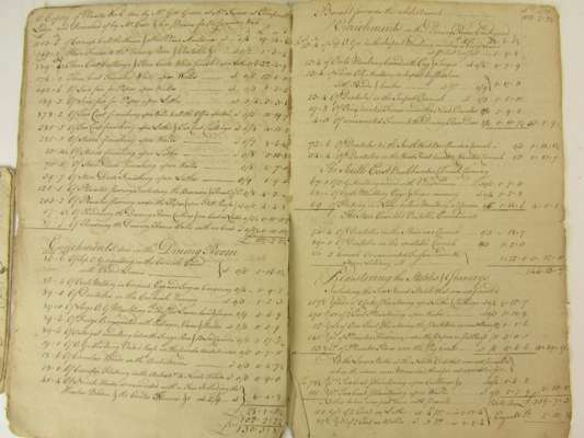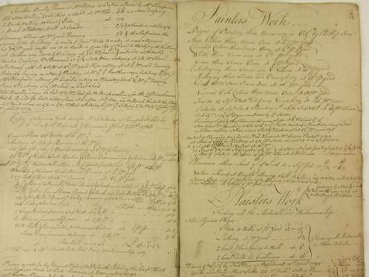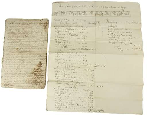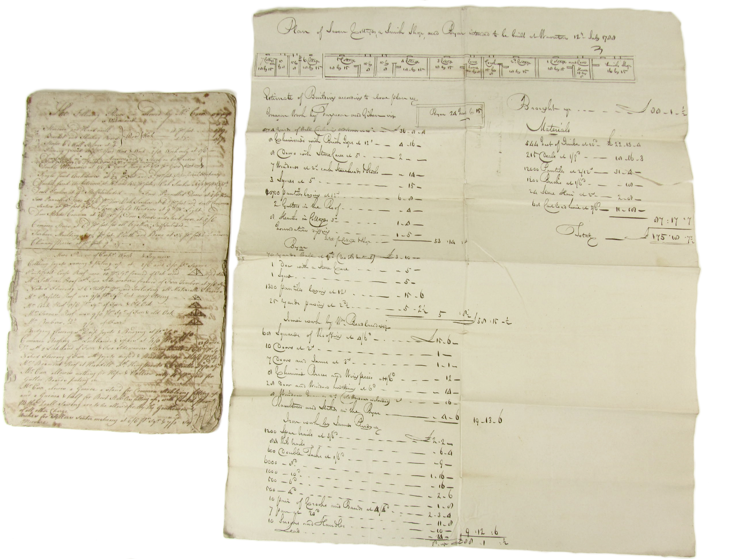 Plan of Seven Cottages, a Smith Shop, and Byar, intended to be built at Marston, 12 July, 1788, single folio leaf, 49 x 40cm, head of sheet showing sketch of a single row of estate cottages with a smith's at one end and byre at the front with, below, a detailed estimate for the work to be done by different tradesmen (including masons, joiners & iron workers), detailing the materials with the cost of each item, and grand total, [Provenance: Thomas Adams, Alnwick solicitor], short tear to one side without loss; Builders' Estimates and Prices Manuscript in ink beginning "The following prises as allowed by Mr Car as Underneath", folio, 16pp, stitched together, c. 1790. The account opens with prices charged by Mr Carr, who, on internal evidence must be John Carr the Yorkshire architect, with prices for work done for specific customers, including "Mr Sotheran's Roof (probably Grove Hall, Darrington". Other names mentioned in connection with pricing include Thomas Hall, for repointing, William Mallard in connection with the park wall at Nostell [Priory], joiners at Cock Royd at Horbury at Mr John Baildon House 1788, painting work by "Phillop Ince", work done at "Elmpsall Lodge [?Elmsall Lodge? Elmhall Lodge?] measured of by Mr Carr & his prises for the forgoing work including "enrichments in the dining room", mouldings, friezes and plastering work, some browning and general soiling (2)