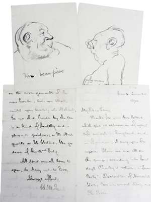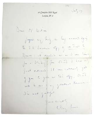 John Betjeman (9 letters signed (5 autograph), to Canon Bernard Mortlock, on the conservation of church architecture, 15 pages, 1951-64), Sir Winston Churchill (typed letter signed on constituency affairs, 1 page, 7 July 1955), Robert Graves (2 autograph notes signed responding to enquiries from schoolchildren, 1962-69), Henry Hallam, C. Day Lewis, Sir A.J. Munnings (autograph menu and sketch), T.S. Eliot (two Christmas cards, signed, one with an accompanying autograph note, and a typed letter signed to Francis Berry, 7 December 1955), Siegfried Sassoon, John Masefield, G.B. Shaw (autograph draft letter to Daily Herald, 23 October 1931, and one other), Edmund Blunden (2 letters), H.W. Longfellow, Edith Sitwell, Hammond Innes (manuscript draft short story entitled 'Another Intake Joins Ship', 10 pages), William Burroughs (2 postcards and 2 typed letters signed), Groucho Marx, Anthony Thwaite (autograph manuscript, 11 pages), Christopher Logue (3 copies of a broadsheet, signed), and others, including correspondence with the dealer Jake Schwartz, cuttings and ephemera, altogether about 60 items, housed loose in three folders with some additional items loose in a manila envelope; also 5 copies of Phillips catalogues: Autograph letters and historical documents, Thursday 11 December 1986, one marked-up