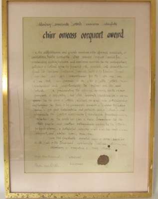 "Oddenberry Looniversity Sottish Renaesense Sodsighity." "Schirr Tomeass Oorquart Aaweird." Humourous manuscript certificate conferring the Sir Thomas Urquhart Award for Outstanding Contributions and Meritous Services to the contemporary culture of Scotland "upone the femmeous pote, crawtick and dramortits Gud Sir Skidderie Smithereens, Barrenut, Nicht o the Dricken Thrissel...", signed by Hugh MacDiarmid, President, and Alasdair MacCallum, Chairman, framed, 52 x 38cm., some fading