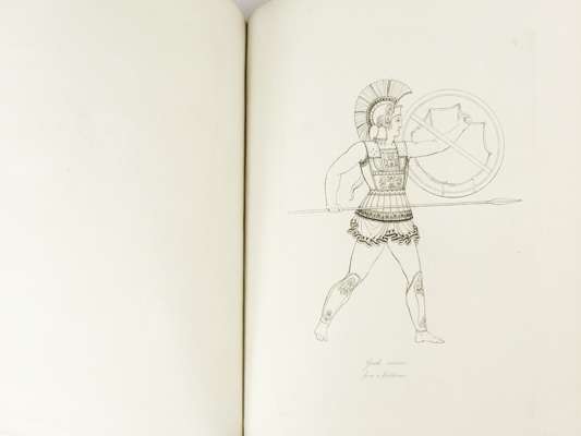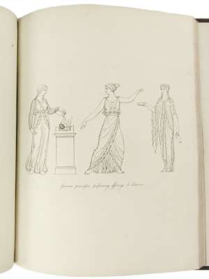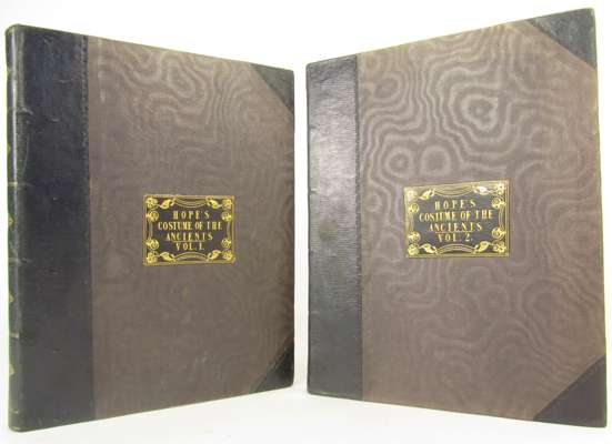 Costume of the ancients. London: William Miller, 1809. First edition, 2 volumes, 4to, presentation copy, inscribed in volume 1 from Thomas Hope to his father-in-law "To the Archbishop of Tuam from the Author, May 9, 1809", 200 engraved plates, half-titles, contemporary half black straight-grain morocco over mauve moiré silk covered boards, morocco and gilt lettering piece to centre of each board, a very bright set