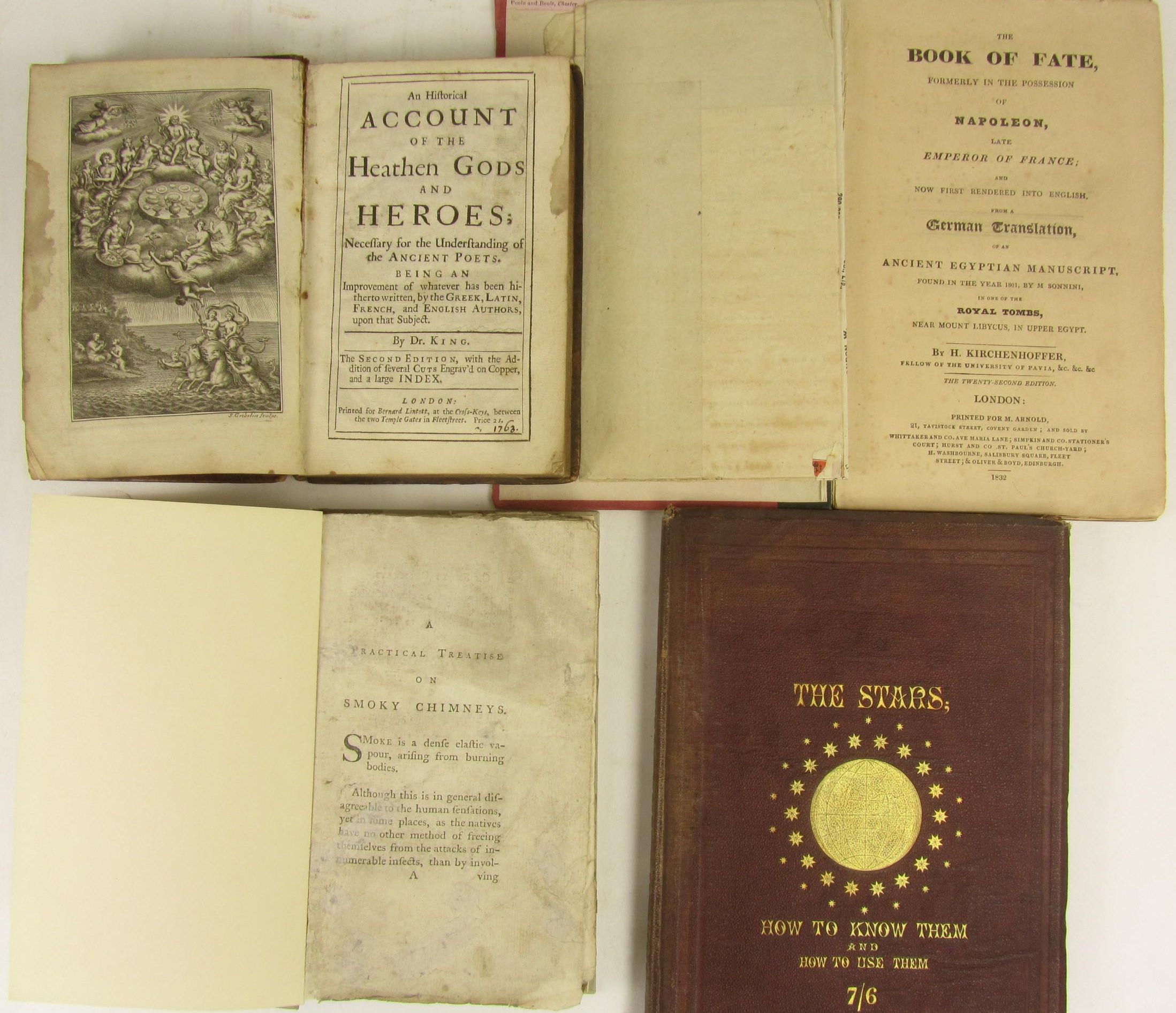 A practical treatise on smoky chimneys. [1787 of 1793]. 8vo, 1 folding plate (at p.24) of 2, modern cloth-backed boards, lacks title, [text commencing at A1], first few leaves soiled and with a few repairs; Kirchenhoffer, H. The book of fate. London, 1832. 8vo, original boards, folding table split repaired and split at folds, rebacked, table loose King, Dr. An historical account of the heathen gods and heroes. London, [1763]. Second edition, 8vo, 6 engraved plates, contemporary calf, slightly stained; Rosser, W.H. The stars. 1874. Large 8vo, original cloth, rubbed (4)