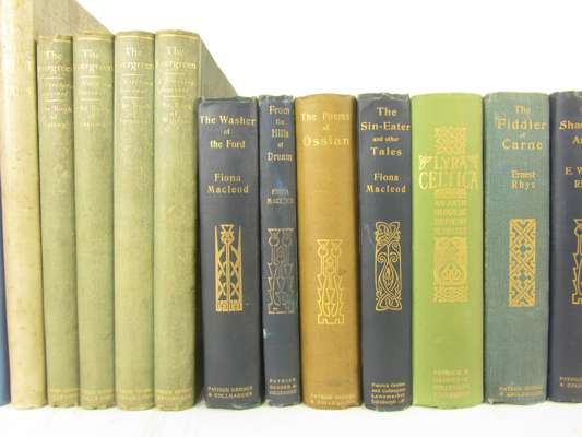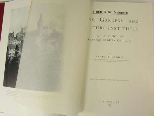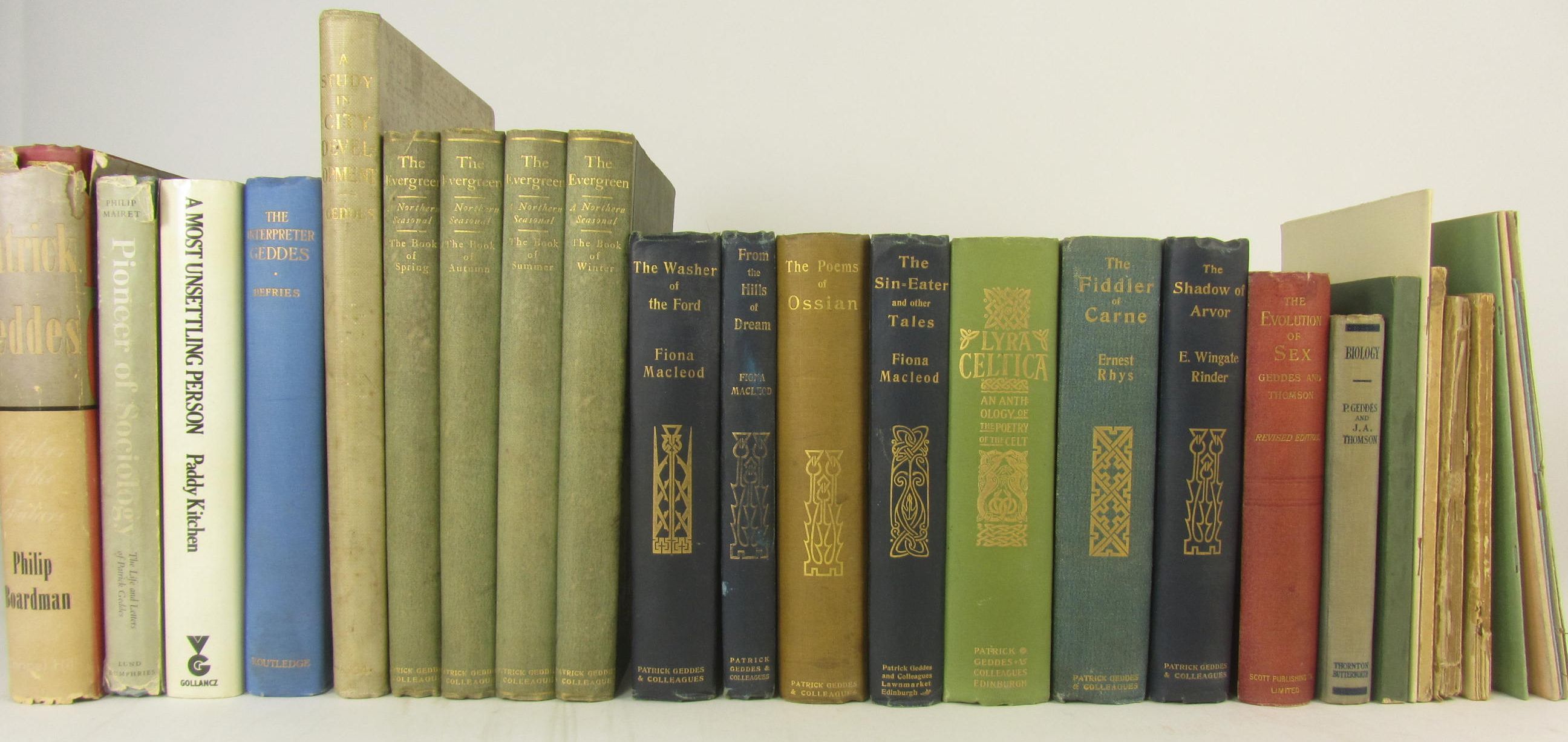 A study in city development. Park, gardens and culture-institutes. Dumfermline, 1904. First edition, 4to, folding map, illustrations, original cloth, binding spotted; The Evergreen, a Northern seasonal. 1895. Edinburgh, 1895-96. 4 volumes, 4to, plates & illustrations, original cloth-backed boards; Macleod, Fiona The washer of the Ford. Edinburgh: P. Geddes, 1896. Presentation copy, original cloth; Macleod, Fiona From the hills of dream. Edinburgh: P. Geddes, original cloth; Macpherson, J. The poems of Ossian. Edinburgh: P. Geddes, 1896, original cloth, spine faded; Macleod, Fiona The Sin-Eater. Edinburgh: P. Geddes, 1895; Sharp, E.A., editor Lyra Celtica. Edinburgh: P. Geddes, 1896, original cloth; Rhys, E. The fiddler of carne. Edinburgh: P. Geddes, 1896, original cloth; Rinder, E.W. The shadow of Arvor. Edinburgh: P. Geddes, [n.d.], original cloth; 11 others published by or related to Geddes, and 4 biographies of Geddes (27)