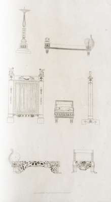 Household furniture and interior decoration, executed from designs by Thomas Hope. London: Longman, Hurst, Rees & Orme, 1807. Folio, (481 x 295mm.), engraved title, and 60 engraved plates, early 20th century full vellum, without half-title, some spotting, tear to plate 9 & 49 repaired