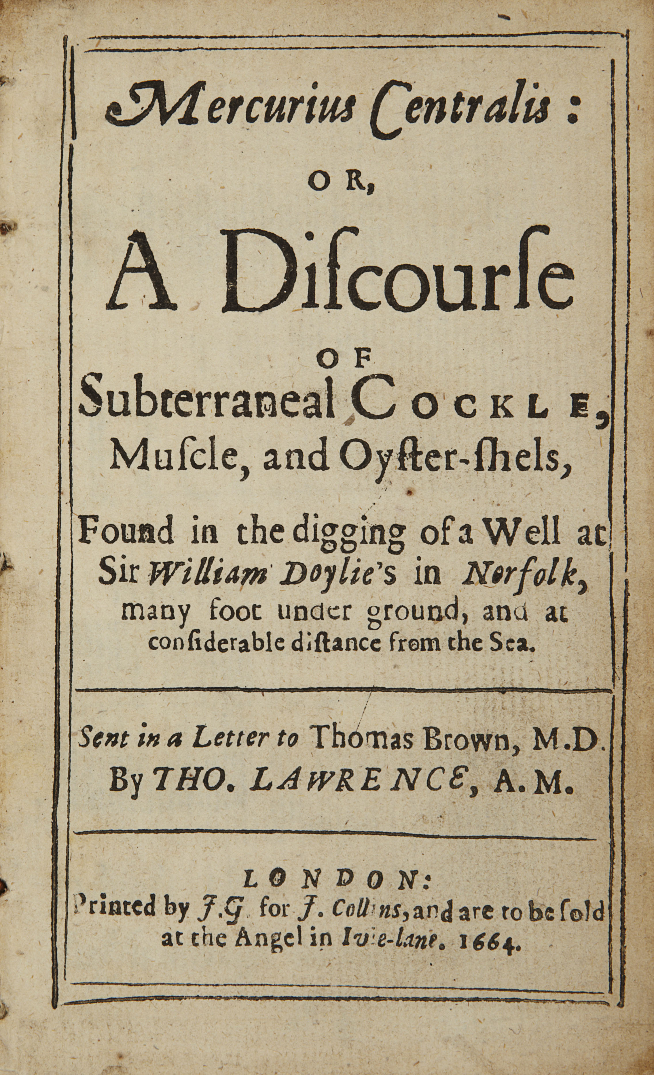 Mercurius centralis: Or, a discourse of subterraneal cockle, muscle, and oyster-shels, found in the digging of a well at Sir William Doylie's in Norfolk, many foot under ground, and at considerable distance from the sea. In a letter to Thomas Brown, M.D. London: J.G. for J. Collins, 1664. 12mo, contemporary sheep, imprimatur leaf stuck to front board