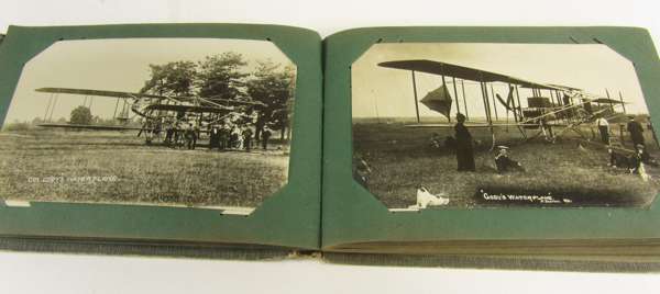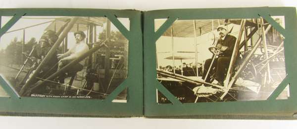 Album of photographic postcards, 27 of Cody with various planes including Waterplane, portraits, crash or his funeral; and another 12 of biplane B.E. type, Maurice Farman biplane, monoplane, Brequet biplane, &c. most by F. Scovell, in postcard album, [c.1910-1914]