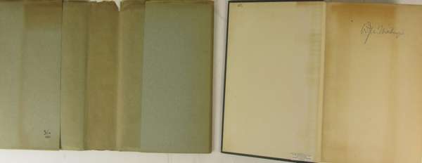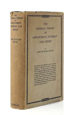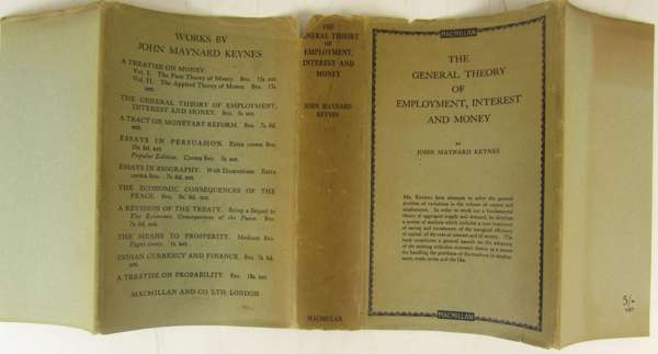 The general theory of employment, interest and money. London: Macmillan, 1936. First edition, 8vo, original green cloth, dustwrapper discoloured, frayed at upper edge with a few small chips, endpaper discoloured and with inscription "W.L.M. Mackenzie", a few pages slightly discoloured, small red scribble to upper wrapper