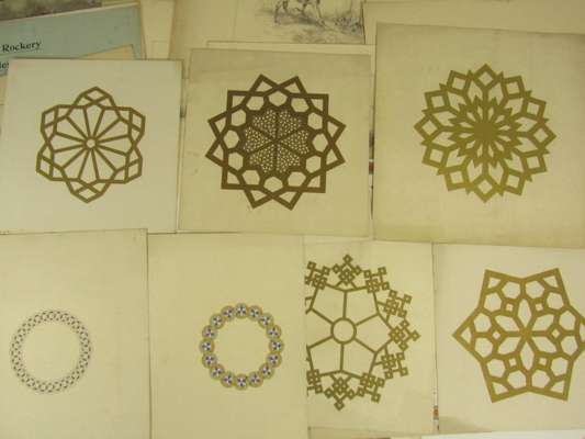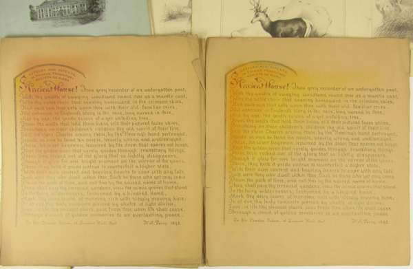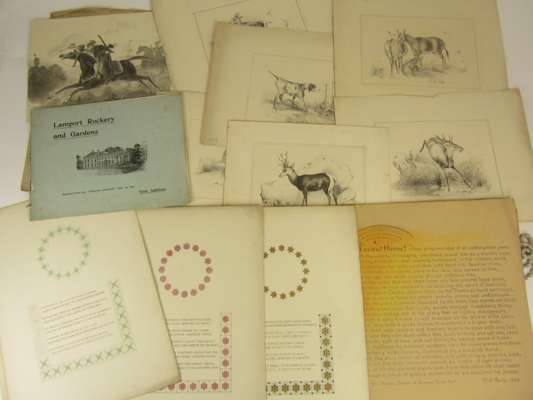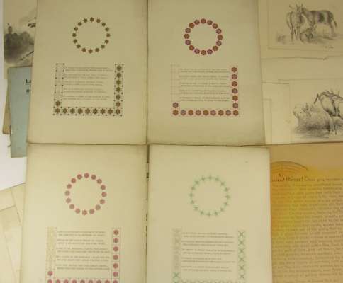 Ancient House! Poem on lithographed sheet, 38 x 34.5cm., dated 1895, 6 copies, each partly hand-coloured; How comes the Millipede, with trailing light; As nature caused me to come forth by night; The Butterfly so gay on every flower. 3 Poems, manuscript text, colour printed and hand finished borders, on card, 38 x 27cm; 6 pencil drawings by Sir Charles Isham of deer, dogs, horses, donkeys & Turkish horseman, signed "Charles" on verso, one signed Charles Edward Isham 1834 on verso; one pencil design, 8 lithographed geometric designs on card, 2 hand-coloured; 2 pp. only of Isham's Poem on the Tyrant of the Cuchullin Hills; Lamport Rockery and Gardens Reprinted from the "Gardeners' Chronicle" Sept. 25, 1897. Oblong 4to, illustrations, original wrappers, spine frayed; and 3 items not by Isham