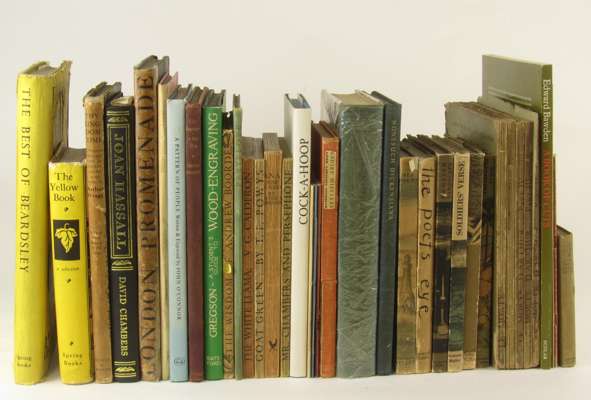 The Golden Cockerel Press: Powys, T.F. Goat green..., 1937; Abdul, Prince Mahmoud, attr. Ana the runner..., 1937; Whitfield, C. Mr. Chambers and Persephone, 1937; Calderon, V.G. The white llama, 1938; [all in original card wrappers]; Pertelote, a sequel to chanticleer, being a bibliography of the Golden Cockerell Press, 1943; Cock-a-hoop...being a bibliography of the Golden Cockerel Press, [n.d.]; and 3 Golden Cockerel catalogues; The Nonesuch Press: Laver, James Ladies' mistakes, 1933; The Nonesuch Dickens, 1937; Laclos, Choderlos de Dangerous acquaintances, 1940; New excursions into English poetry: Sea poems, 1944; The poet's eye, 1944; English, Scottish & Welsh landscape, 1944; Soldiers' verse, 1945; Poems of death, 1945; Travellers' verse, 1946; [all with dust-jackets, illustrated with lithographs]; Malory, Sir Thomas, Bart. - Aubrey Beardsley Le morte Darthur. London: J.M. Dent & Co., [1893?] 8vo, 6 parts only containing pp.97-455, with limitation page, title, contents, preface and table up to p.lxiv at rear of final volume, original paper wrappers, chipped, torn and detached; and 3 other volumes relating to Beardsley; Crisp, Quentin All this and Bevin too, 1943; and 9 others, sold not subject to return (36)