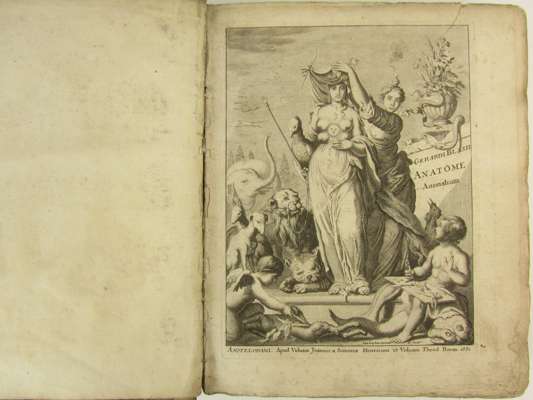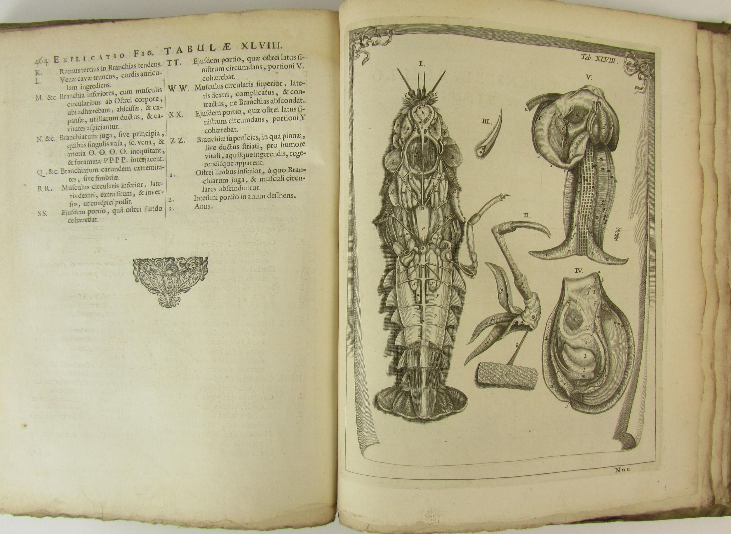 Anatome Animalium. Amsterdam: Joannis à Someren 1681. First edition, 4to, contemporary quarter vellum and marbled boards, spine lettered in ink, vellum tips to boards, uncut throughout, (3) + 496pp, engraved frontispiece, 65 fine engraved plates, ownership in ink on the front blank leaf "W.Hurd M.D. e Coll.Eden 1751", first few leaves dust stained, sides slightly rubbed; [Garrison & Morton, 296. Cole, History of Comparative Anatomy pp.150-155. Singer, History of Biology pp.208-9. Wood, Literature of vertebrate zoology p.243. Thornton, Scientific Books, pp.128-9]