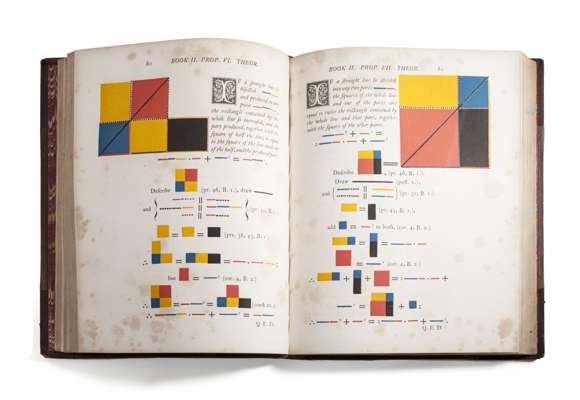 The first six books of the elements of Euclid, edited by Oliver Byrne. London: W. Pickering, 1847. 4to, coloured illustrations, half-title, nineteenth century maroon half morocco, spotted throughout and occasional browning, rubbed