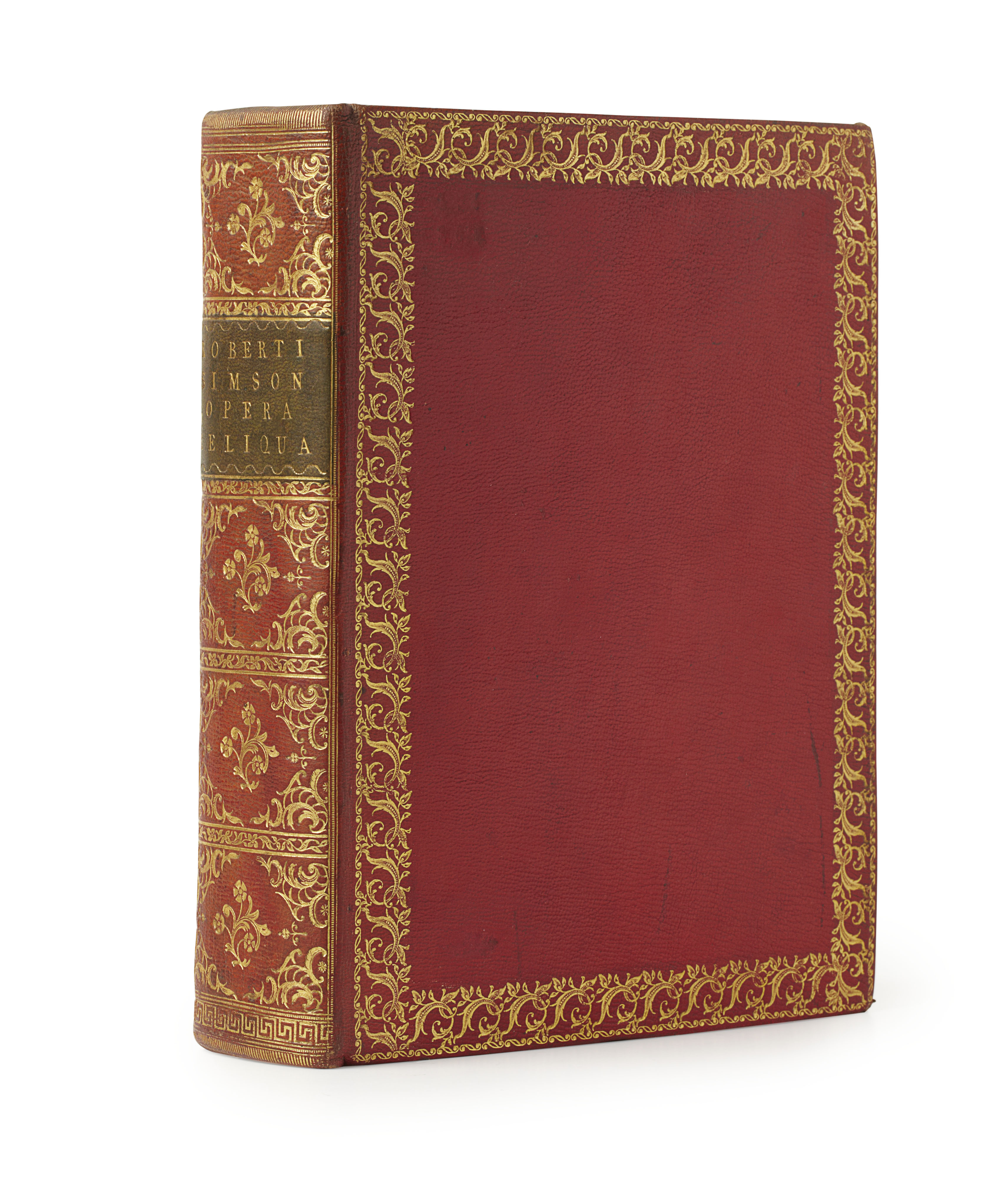 Opera quaedam reliqua. Glasgow, Robert and Andrew Foulis 1776. 4to, contemporary red goatskin, possibly from the Foulis bindery, the covers with a gilt border of a chain roll and a repeated rococo floral tool, smooth spine panelled in gilt, lettered on a green goatskin label, elaborately gilt tooled, marbled endleaves, edges gilt, (4) leaves + xpp + 594pp + (1)leaf + 32pp + (1)leaf + 33pp + (1)leaf + 23pp, bookplate on front paste down, small discreet perforated cypher on title and de-accession stamp on verso of title, [Gaskell, The Foulis Press, no.600]