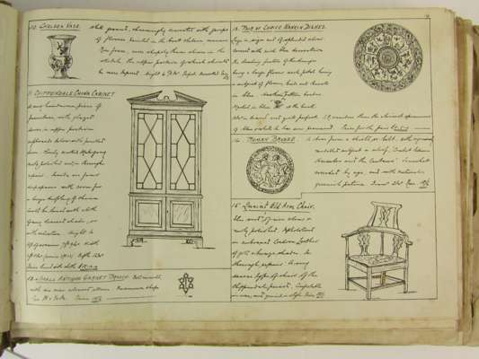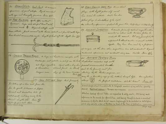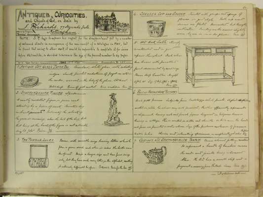 Note: S. Richards traded in Nottingham in the period c.1880-1920 and his catalogues, published monthly, offer a fascinating insight into the taste, classifications, descriptions, and prices for antiques in the period. Richards seems to have produced these hand-drawn catalogues from the 1880s up until the end of the First World War, posting them out to collectors. He sold a very wide range of antiques and ‘curios’ and the pages illustrate what remain as standard ‘antique’ collectable objects.