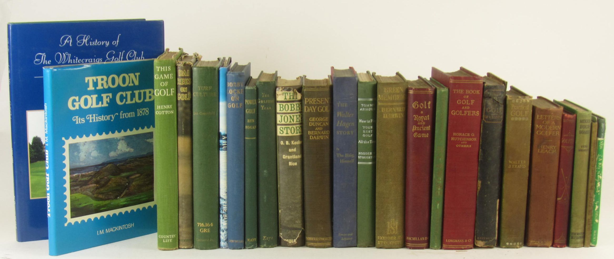 Simpson, Sir W.G. The art of golf. Edinburgh: David Douglas, 1887. 8vo, original quarter morocco, worn, upper cover detached; Hutchinson, Horace G. The book of golf and golfers, 1899. 8vo, original red cloth gilt; Leach, Henry Letters of a modern golfer to his grandfather, [1910]. 8vo, original red cloth gilt, worn; Golf Golfing: a handbook to the royal and ancient game, 1887. 8vo, original red cloth; Clark, Robert, editor Golf: a royal and ancient game, 1899. 8vo, original cloth; Darwin, Bernard Green memories, [n.d.] 8vo, original green cloth gilt; Travis, Walter J. Practical golf, 1903. 8vo, original green cloth gilt; Hutchinson, Horace G. Hints on the game of golf, 18995. Ninth edition, 8vo, original cloth; Mackintosh, I.M. Troon Golf Club..., 1974, signed by the author, with dust-jacket; and 15 others, sold not subject to return (24)