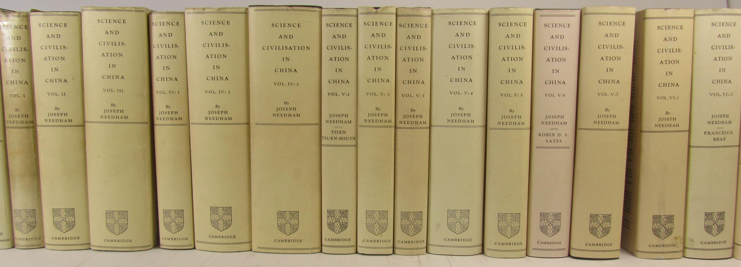 Science and civilisation in China. Cambridge University Press, 1972-2008. 24 volumes, 4to, comprising: volumes 1-3, 4 (parts 1-3), 5 (1-7, 9, 11-13; with part 7 present but in the incorrect dust-jacket), 6 (parts 1-3 & 5-6), and 7 (parts 1-2), 4to, original cloth, dust-jackets