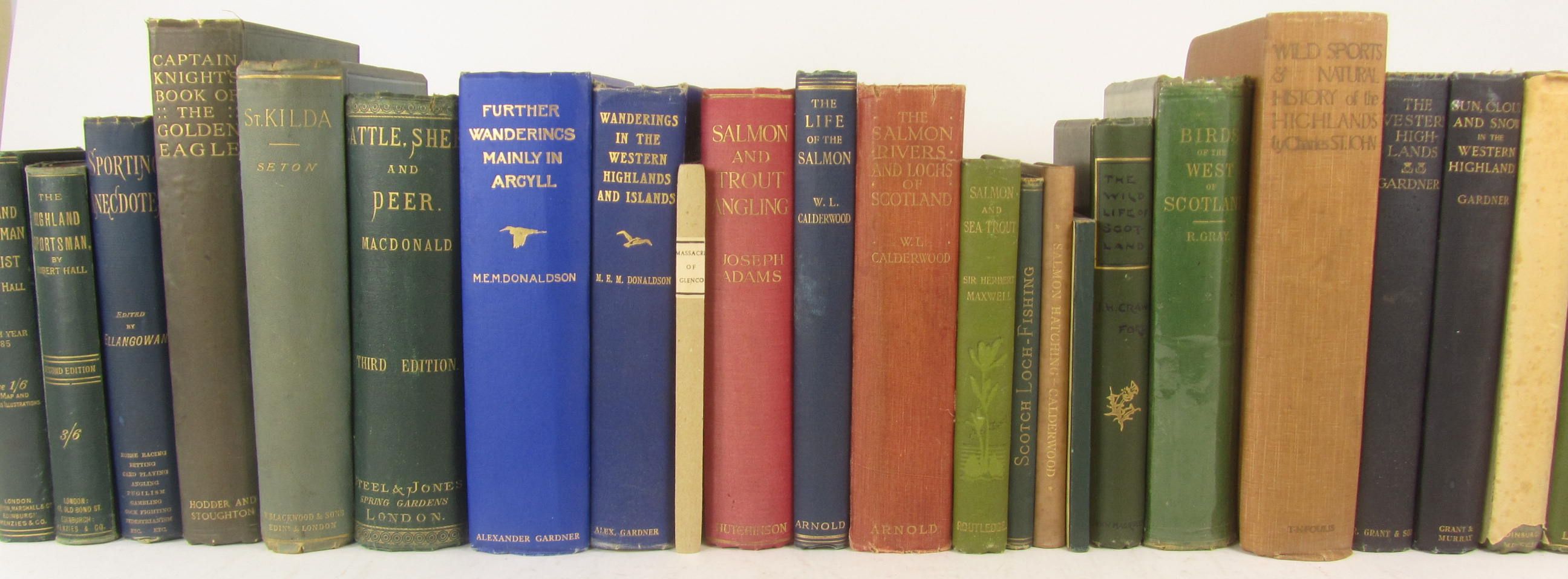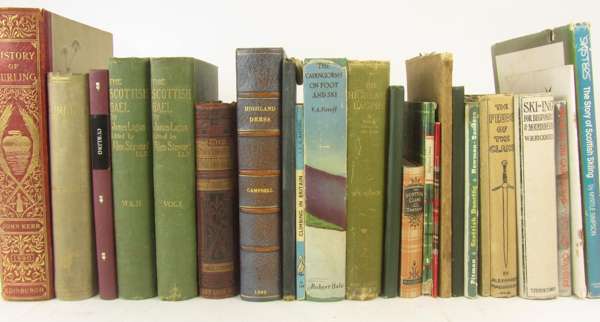 St. Kilda. 1878, original cloth, slightly soiled; Kerr, J. The history of curling. 1890, original red morocco-backed boards, slightly rubbed; Campbell, A. Highland dress, arms and ornament. 1899, one of 250 copies, half morocco; Taylor, J. Curling, the ancient Scottish game. 1884, original cloth; Grimble, A. Deer-stalking. 1886, original cloth, soiled; Blackburn, H. Birds from Moidart and elsewhere. 1895, original pictorial cloth, spine faded; [Glencoe] The massacre of Glenco. 1818, later boards Knight, C.W.R. The book of the golden eagle. [N.d.], original cloth, rubbed; Macdonald, D.G.F. Cattle, sheep and deer. 1872, original cloth; Hall, RE. The Highland sportsman and tourist. [c.1885], map in pocket, plates, original cloth; another edition, [undated], map in broken pocket; "Ellangowan" Sporting anecdotes. 1889, original cloth; Donaldson, M.E.M. Wanderings in the Western Highlands and Islands. 1923, original cloth; Further Wanderings - mainly in Argyll. [n.d.], original pictorial cloth; Gardner, A. The peaks, lochs & coasts of the Western Highlands. 1924, original buckram, faded; Scrope, W. The art of deer-stalking. 1897, half parchment; Graham, H.D. The birds of Iona & Mull. 1890, original cloth; Grimble, A. The salmon rivers of Scotland. 1913, original cloth; and c.73 others; sold not subject to return (c.88)