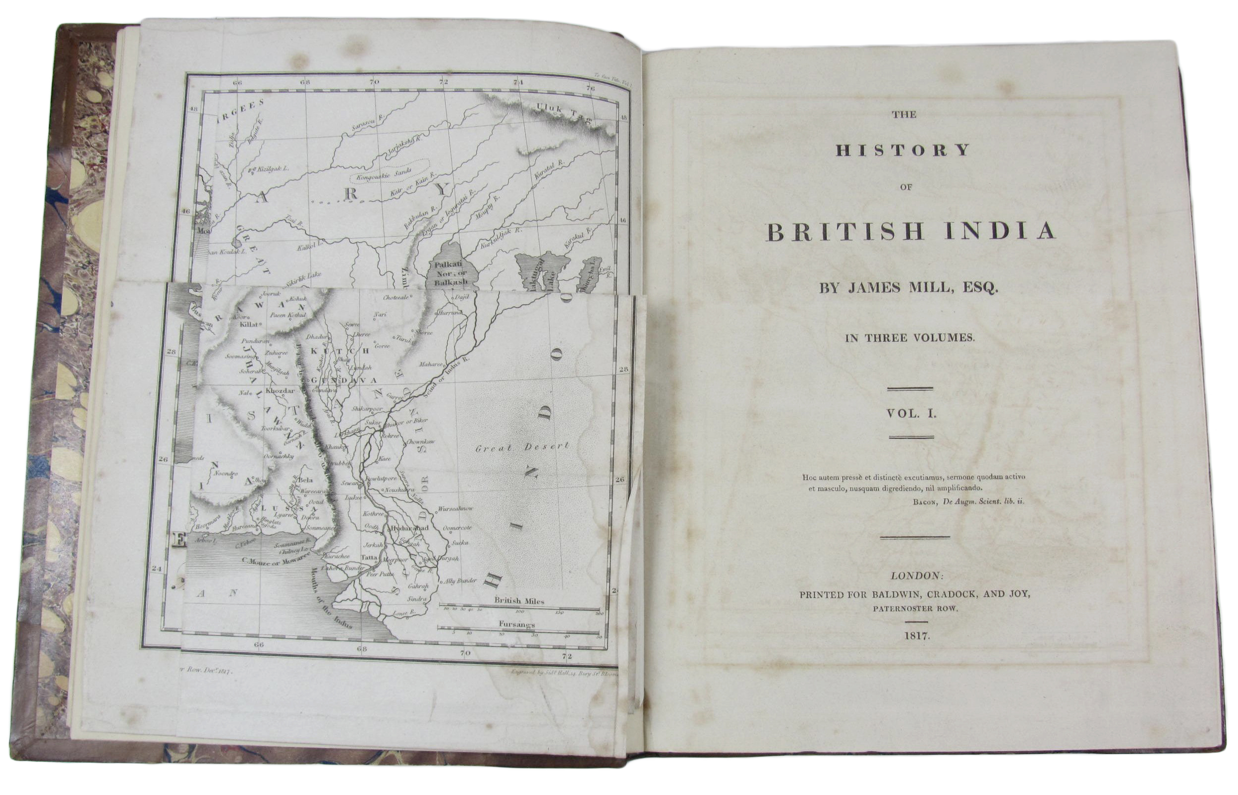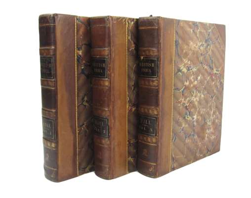 The history of British India. London: Baldwin, Cradock and Joy, 1817. First edition, 3 volumes, 4to., contemporary quarter calf and marbled boards, skilfully rebacked retaining original spines, armorial device at base, labels lettered gilt, marbled endpapers, leaf edges marbled, pp. xxxii, 648; viii, 720; viii, 777, [1, blank]; folding engraved map in volumes I & II, the second one hand coloured
