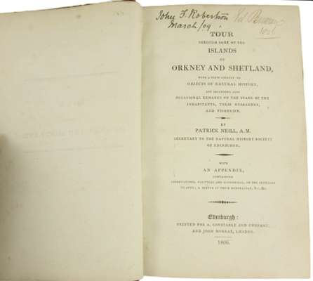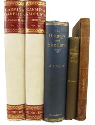 A tour through some of the islands of Orkney and Shetland. Edinburgh: A. Constable, 1806. First edition, 8vo, half-title, contemporary half calf, previous owners' signatures to head of title, upper hinge repaired; Tudor, J.R. The Orkneys and Shetland. 1883. 8vo, plates, coloured maps, original cloth, binding slightly marked; Willcock, John A Shetland Minister of the eighteenth century. Kirkwall: The Leonards, 1897, 8vo, original cloth; Carmichael, Alexander Carmina Gadelica. Edinburgh, 1900. 2 volumes, 4to, frontispiece, original white boards, red morocco labels, t.e.g., boards slightly dust-soiled (5)