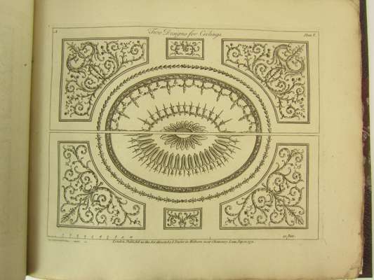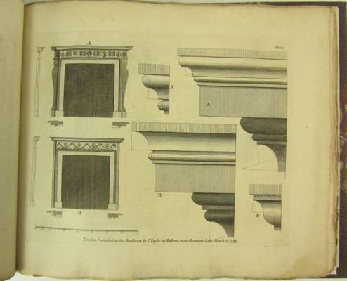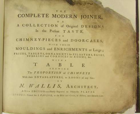 The complete modern joiner, or a collection of original designs in the present taste, for chimney-pieces and door-cases. London: I. Taylor, [1772]. Oblong 4to [231 x 265mm.], 36 engraved plates, [4pp. text], corners of title-page, text leaf, and final 2 plates repaired without loss, [bound with] Wallis, N. A book of ornaments in the Palmyrene taste, London: I. Taylor, 1771, engraved title and 11 engraved plates, corner of title/plate 1 and plate 2 repaired without loss, 2 works in one volume, modern maroon half morocco, gilt lettering piece