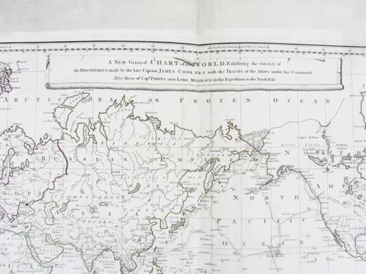 A new general chart of the world, exhibiting the whole of the discoveries made by the late Captain James Cook. London, 1787. Engraved chart, hand-coloured in outline, 530 x 720mm., laid down on linen
