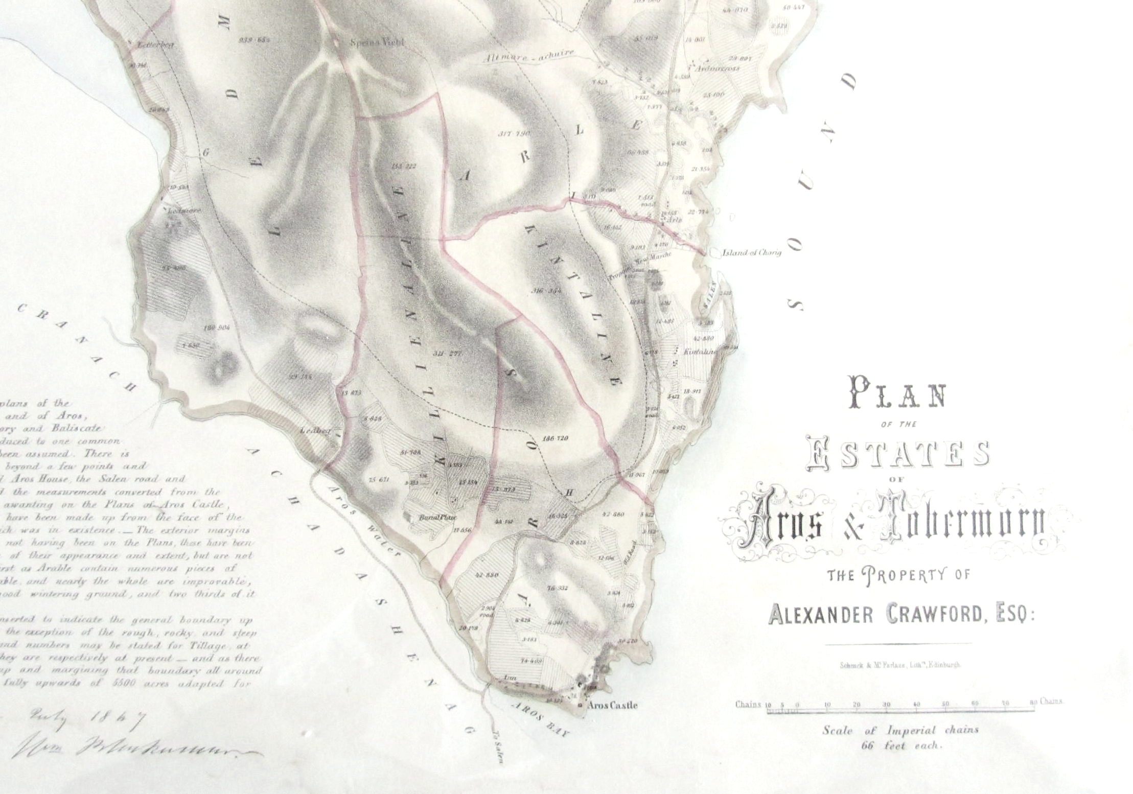 Plan of the Estates of Aros & Tobermory, the property of Alexander Crawford. Edinburgh: Schenck & McFarlane, lithographers, 1847. Hand-coloured lithograph map, 66 x 50.5cm, cream window mount, VERY RARE, [Moir, D. The Early Maps of Scotland, vol. 2, County maps - Argyle, NOT LISTED]
