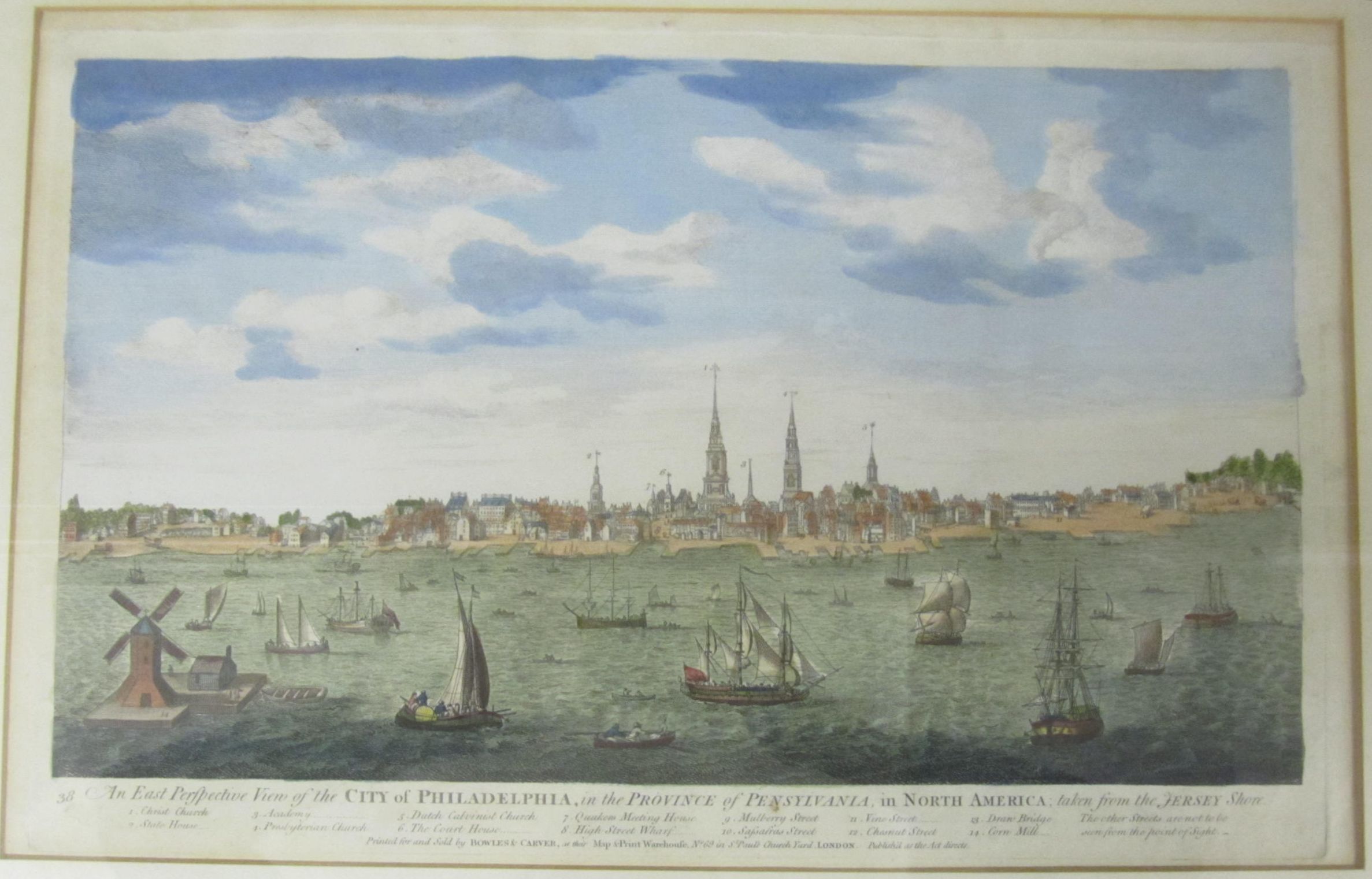 An east perspective view of the city of Philadelphia, in the province of Pennsylvania, in North America; taken from the Jersey Shore. London: Bowles & Carver, [n.d., but 1794 imprint?], c.27 x 42cm to plate line, on wove paper, hand-coloured, framed and glazed