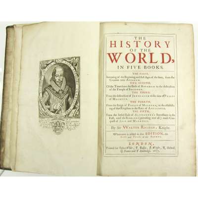 The History of the World. London: Robert White, T. Basset, &c., 1677. Folio, engraved portrait frontispiece, additional engraved title, title printed in red and black, 8 double page engraved maps and plates, contemporary panelled calf, neatly rebacked retaining original spine, corners neatly repaired, [ESTC R33510]