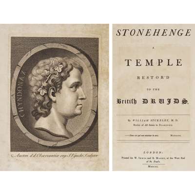 Stonehenge, a Temple Restor'd to the British Druids. London: W. Innys and R. Manby, 1740 [but actually c.1835]. Folio, later facsimile edition, portrait, 35 plates, folding plate at p.42 trimmed with some loss; [bound with] [Idem] Abury, a temple of the British Druids... London: W. Innys, R. Manby, B. Dod, [&] J. Brindley, 1743 [but actually 1838]. Folio, later facsimile edition, 40 plates, plan torn; attractive brown morocco gilt rebacked retaining original spine, some light spotting and offsetting