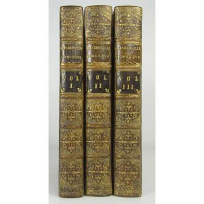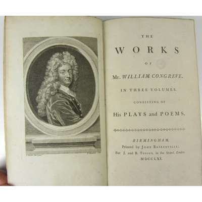 The Works. Birmingham: John Baskerville, 1761. 3 volumes, 8vo, engraved portrait after Kneller and 5 plates by Grignion after F. Hayman, contemporary calf, gilt, neatly rebacked, corners repaired, gilt panelled spines, morocco labels [Gaskell 16]