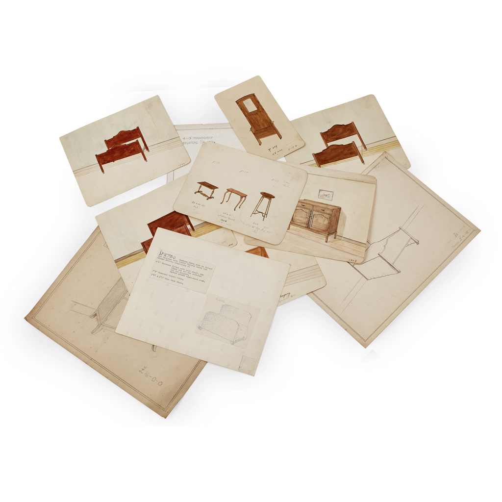 240 early 20th century sketches of furniture (wardrobes, beds, bedsteads, bookcases, occasional tables and other items), 193 of which are hand-coloured, many including information regarding prices, dimensions and materials to be used, plate dimensions range between 22 X 12cm and 37 x 28cm; with a silver gelatin photograph showing 'Bedroom Suite No. 2730' with a stamp showing the initials: A.H. Mc.I to verso; all contained in wooden box with sliding lid