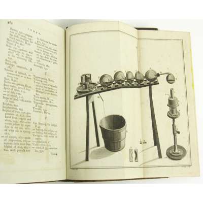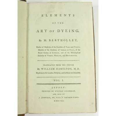 Elements of the Art of Dyeing. London: J. Johnson, 1791. 2 volumes, 8vo, folding plate showing dyeing apparatus in volume 2, contemporary tree calf (2)
